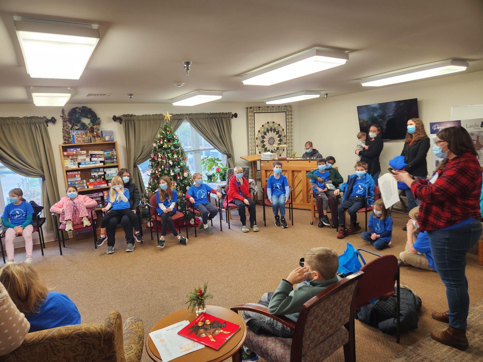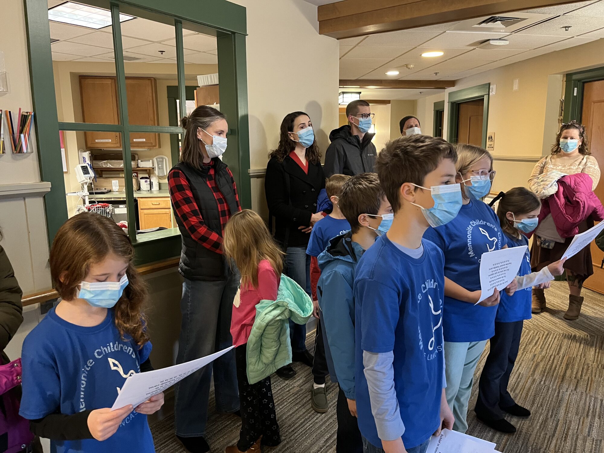 On Saturday, December 13, Carol Choir singers and their parents embarked on a Christmas caroling tour at Landis Homes. Singers from grades 2 through 5 gathered with their parents and MCCL staff before touring, taking time to introduce themselves and connect over favorite colors. They also completed brief feelings check-ins before meeting with Landis Homes staff members Teffie Landmann and Audrey Kanagy. Singers had a chance to review their “brain parts” song, which they learned with Teffie and Audrey at our grant kick-off night.