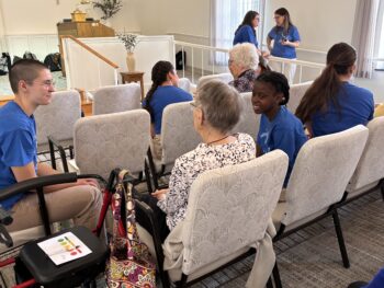 During both visits, students spent time singing, conversing, and sharing stories with residents. Throughout the day, many students referred to “my resident,” a phrase that reflected a growing sense of belonging and personal connection. These interactions quickly became the highlight of the experience.